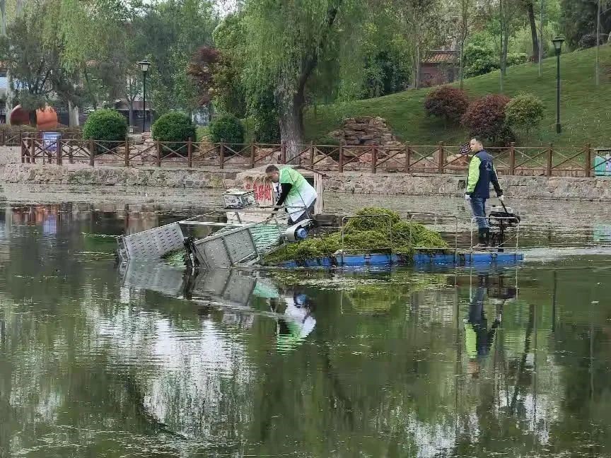 工作人員用機械船打撈水草及湖面漂浮物
