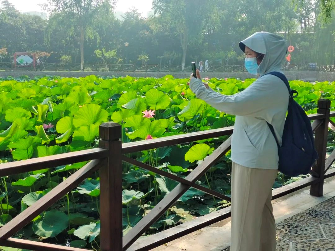 靜待盛綻:共盼千朵荷香滿園。此刻的公園荷塘,雖暫是"小荷才露尖尖角"的嬌羞模樣,卻已蘊藏著盛夏"接天蓮葉無窮碧"的勃勃生機。往年,20余畝荷葉美景讓人流連忘返:碧波之上,蓮葉如蓋,層層疊疊鋪向遠方,織就一湖翠色錦緞;千朵荷花競相綻放,粉白嬌妍,亭亭玉立,恰似仙子凌波;微風(fēng)過處,荷香浮動,彌漫了整個湖畔。身著漢服的姑娘們,手執(zhí)團扇,巧笑嫣然,在荷塘邊、曲橋上留下衣袂飄飄的倩影,人與花相映成趣。環(huán)湖步道上,游人如織,攝影快門聲此起彼伏。更有孩童們指著盛開的荷花興奮不已,老人們則在樹蔭下?lián)u著扇子,笑看這滿塘的熱鬧與生機。待今年粉白花瓣全然舒展,六片花盞托著金盤玉蕊,醉人的荷香將再次漫溢環(huán)湖步道。