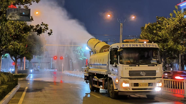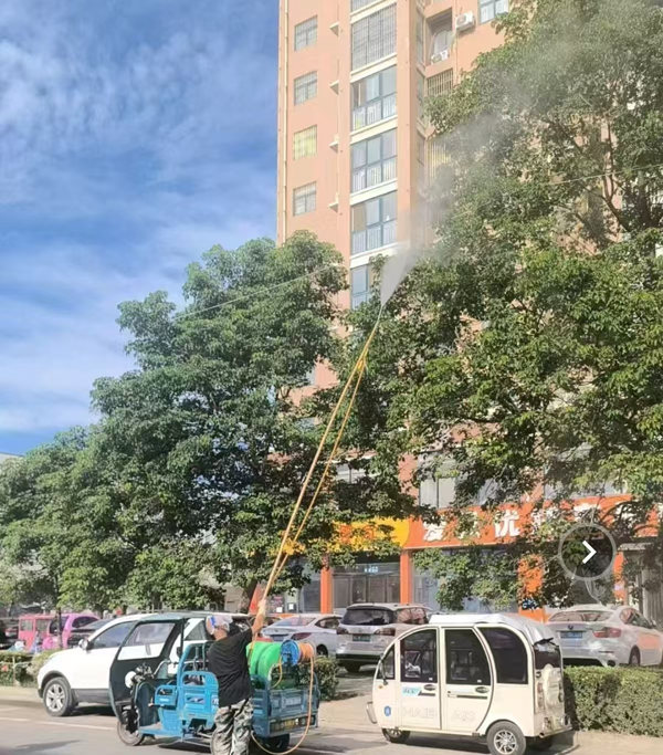 區(qū)園林職工運用高射程噴霧車噴藥物防治白粉虱