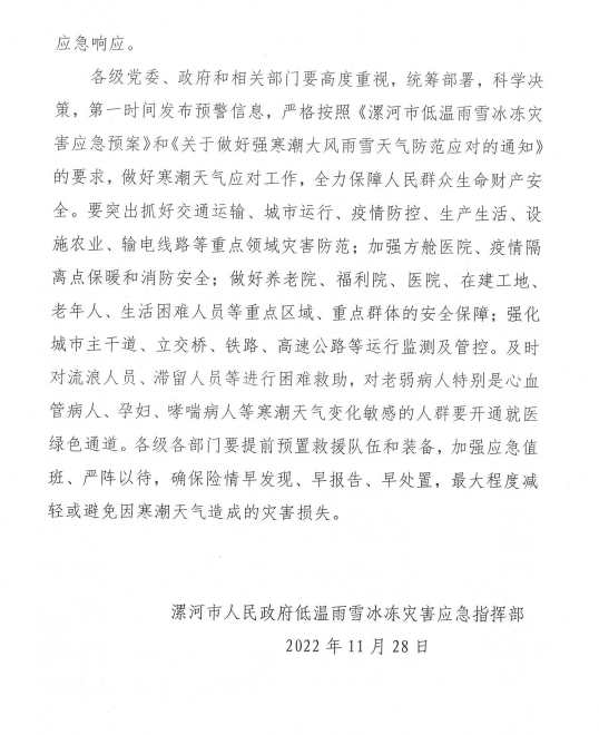 來源:漯河市人民政府低溫雨雪冰凍災(zāi)害應(yīng)急指揮部 時間:2022-11-28 14:10:00 點擊: