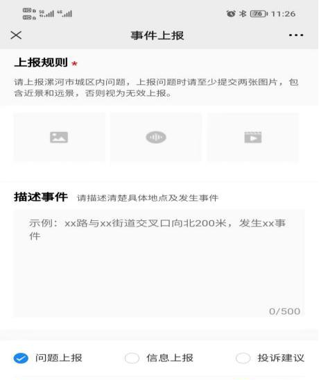 根據(jù)上報規(guī)則上報發(fā)現(xiàn)問題,可以選擇使用圖片(至少上傳兩張圖片,分別包含遠(yuǎn)景和近景)或視頻錄像等方式上傳問題,在描述事件處需將所舉報問題及具體道路位置描述清楚,再次確認(rèn)定位無誤,隨后點(diǎn)擊提交即完成上報。