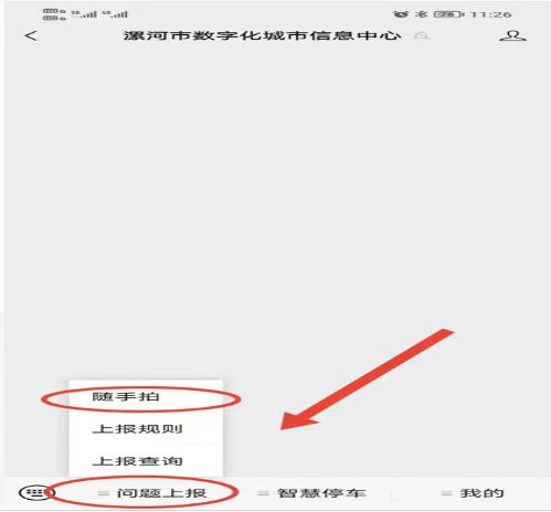 在公眾號主頁左下方點(diǎn)擊“問題上報”專欄,然后選擇“隨手拍”欄,按照規(guī)則提示進(jìn)行操作。