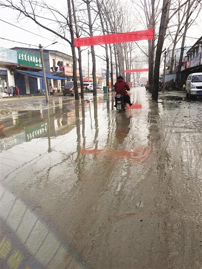1月8日中午,記者來(lái)到現(xiàn)場(chǎng)看到,路上還是一片積水,路兩邊濕漉漉的,路面上臟兮兮的。來(lái)往車輛從道路中間的積水里穿行,行人和騎車者都要小心翼翼地躲到路邊。