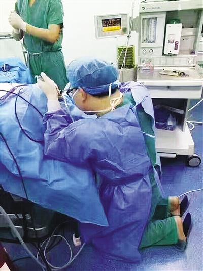 3月15日,該患者被推進(jìn)手術(shù)室。因?yàn)榛颊呗晭в心[物,需要在支撐喉鏡下手術(shù)。“對(duì)患者進(jìn)行麻醉后,為了更好地暴露手術(shù)視野,看清聲帶腫物,我只能跪在地上進(jìn)行手術(shù),因?yàn)橹挥泄蜃藭r(shí)手術(shù)最方便,看到的視野最清晰。”劉世鋒解釋說(shuō)。