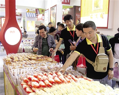 在場館內的A區(qū)入口處,一個帶有濃濃中國風的展位吸引了記者的目光。隨著一個個火紅的繡球望去,原來是“金老大老月餅”的展館。記者一進入展館好像時光就拉回到中秋佳節(jié)。展館正中央,有一個直徑50厘米的大月餅,引來不少人圍觀。“這個月餅是我們這里最大的,可以根據(jù)顧客需要定制。想吃牛肉味的我們就做成牛肉味的,想吃五仁的就做成五仁的,只要顧客想得到,我們都可以做。”工作人員對記者介紹。