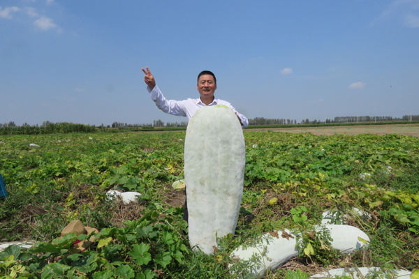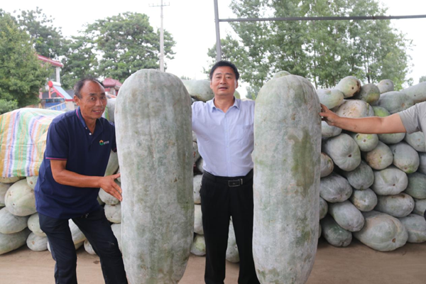 圖為臨潁縣農副產品代言人張付慶與150斤重的冬瓜王合影留念