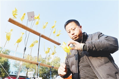 來自安陽滑縣的民間藝人馬軍令正在表演吹糖人。記者 楊東輝 攝