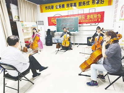 在嵩山社區(qū)多功能室,大提琴班的學(xué)員在練習(xí)大提琴。