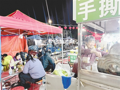 最吸引消費(fèi)者的當(dāng)屬熱乎乎的麻辣面攤位。攤位旁邊的小桌子座無虛席,還有不少顧客選擇打包帶走。“這幾天溫度比較低,但是來吃手撕面的顧客仍然不少。一般傍晚六七點(diǎn)會(huì)迎來一波就餐高峰。有時(shí)候晚上11點(diǎn)還有人來這里吃上一碗面。我們通常營(yíng)業(yè)到深夜12點(diǎn)。忙起來確實(shí)辛苦,但是和家人一起做生意的日子也很幸福。”經(jīng)營(yíng)麻辣面攤位的黨阿姨告訴記者。
