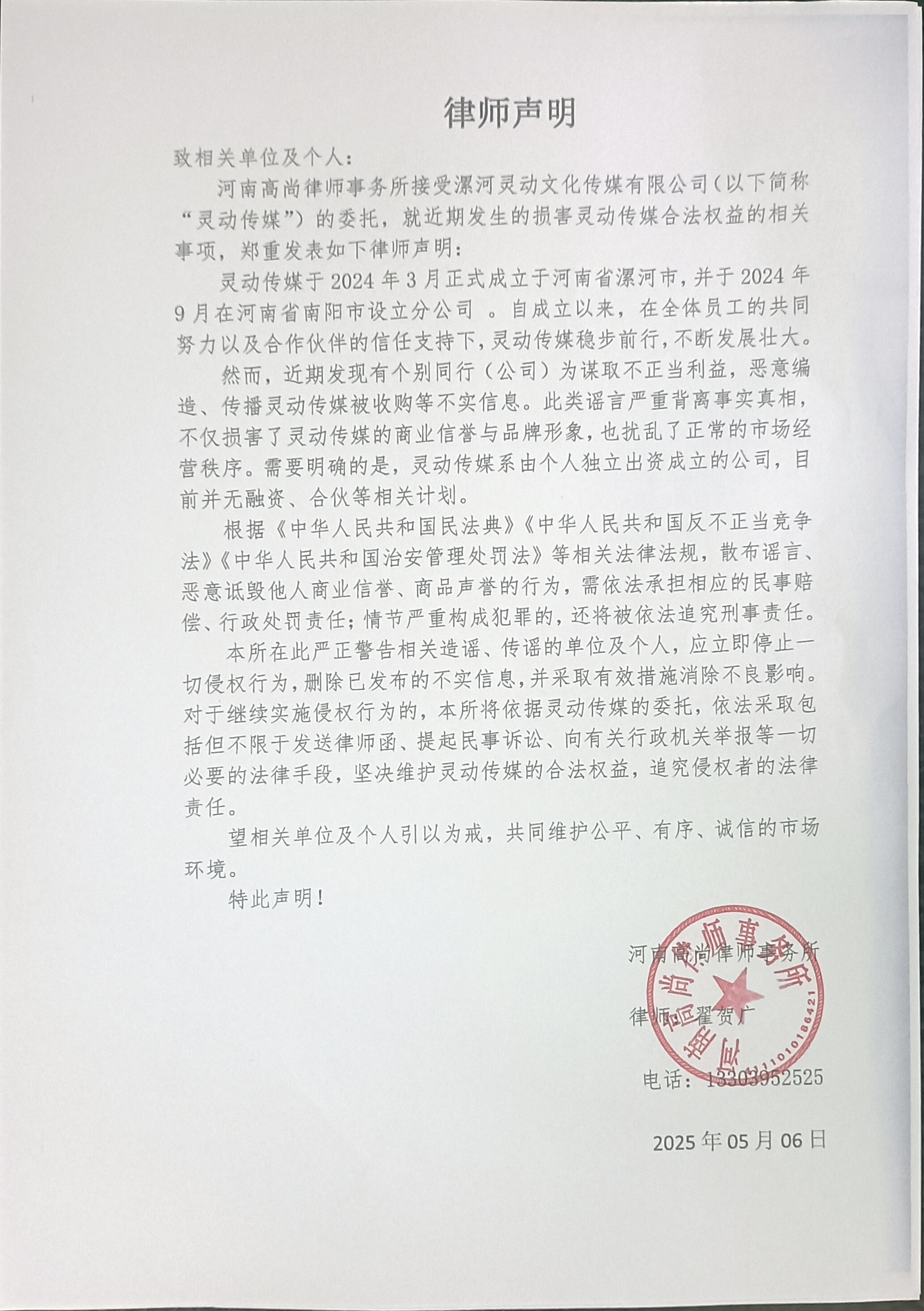 河南高尚律師事務(wù)所接受漯河靈動文化傳媒有限公司(以下簡稱“靈動傳媒”)的委托。就近期發(fā)生的損害靈動傳媒合法權(quán)益的相關(guān)事項,鄭重發(fā)表如下律師聲明:
