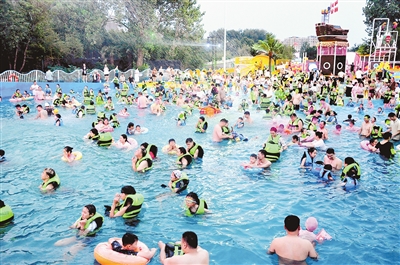 海盜船水寨前也是熱鬧非凡。家長牽著孩子的手穿過水簾,小沖天滑梯上的孩童像炮彈般滑入水池……專為兒童設(shè)計(jì)的戲水區(qū)里,水深二三十厘米,卡通造型的噴水玩具不斷噴出清水,孩子們玩得不亦樂乎。