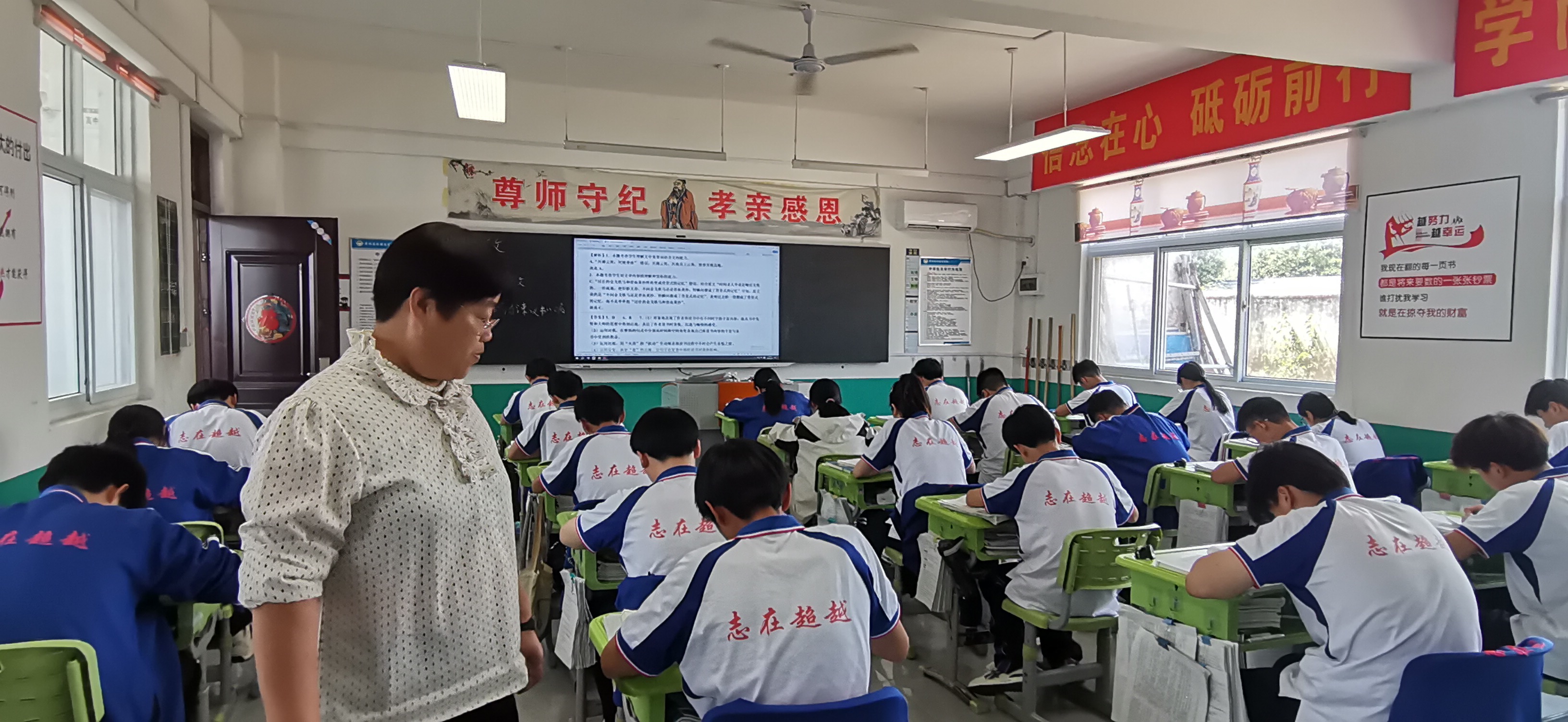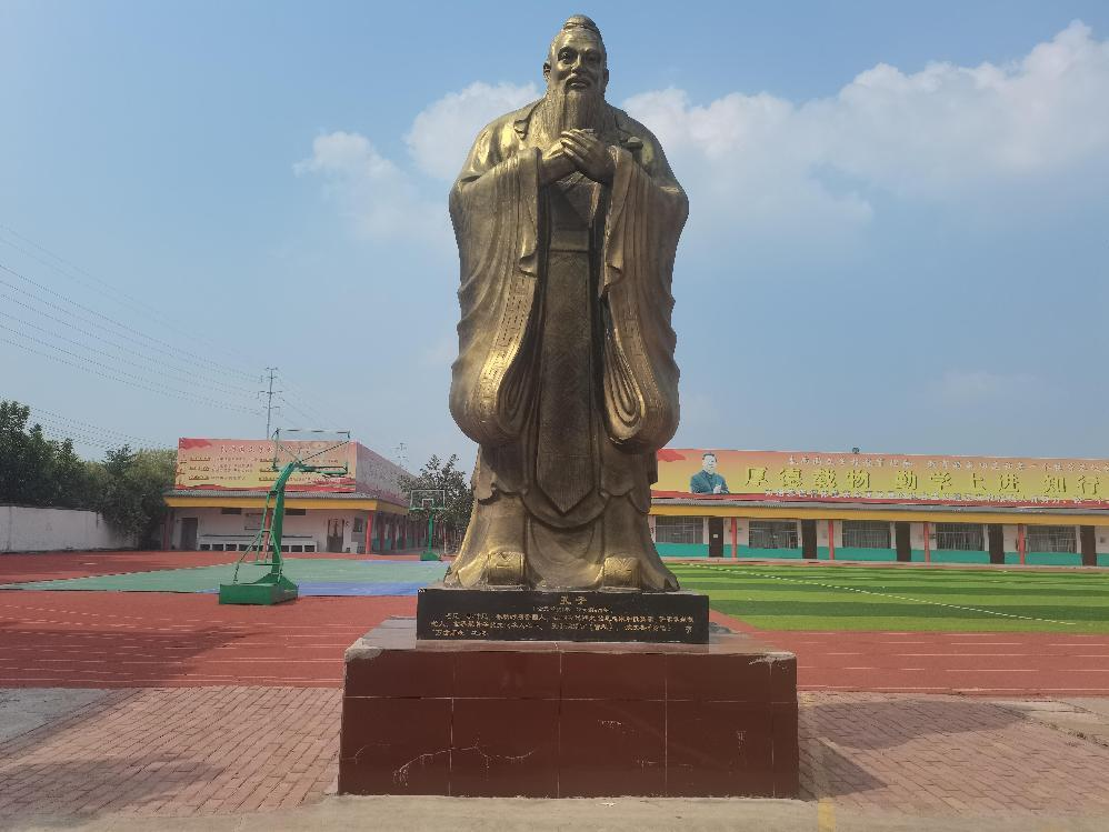 春雨國文學(xué)校的第一節(jié)課上課前,10名教師排列整齊,莊嚴(yán)地站到孔子像前進(jìn)行了宣誓,跟著朱喜洋校長鏗鏘有力地宣讀聲,個別教師讀著讀著竟有想笑場的感覺,但看著朱喜洋校長認(rèn)真嚴(yán)肅的樣子,最終還是忍住了。