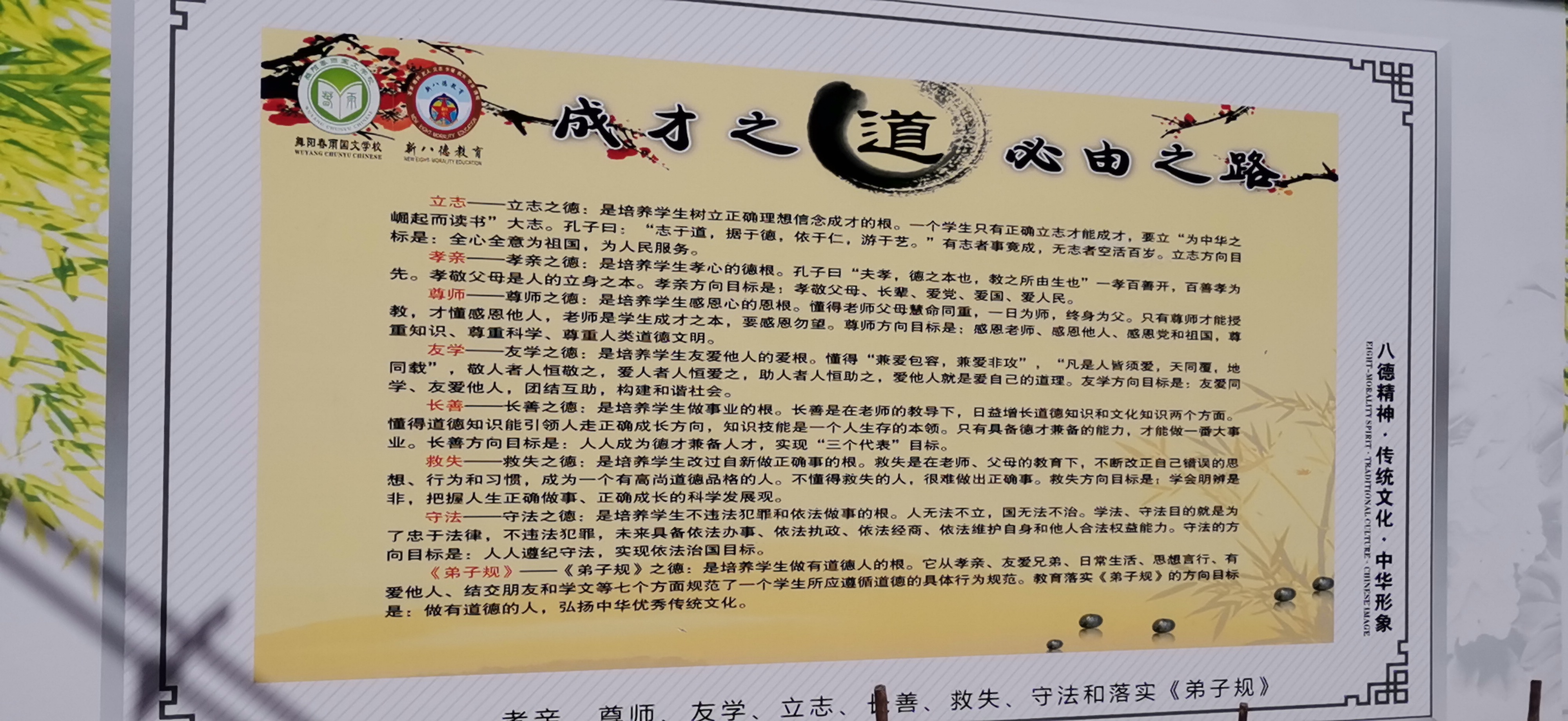 “孝親、尊師、友學(xué)、立志、長善、救失、守法和落實弟子規(guī)八個方面,是培養(yǎng)學(xué)生做人博愛、做事智慧、言行規(guī)范及拓寬心量的高效的立德樹人的教育!”朱喜洋校長對于新八德教育用于春雨國文學(xué)校,滿是自豪和驕傲。