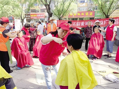 5月13日上午8點(diǎn)半,在市區(qū)煙廠花園廣場(chǎng),閆海燕半蹲著身體,拱著腰,一手拿著剪刀,一手拿著梳子,認(rèn)真地為一位老人理發(fā)。“我以前在家經(jīng)常幫奶奶剪頭發(fā),現(xiàn)在經(jīng)過一年多的鍛煉,手藝更加?jì)故炝恕?rdquo;閆海燕笑著說(shuō)。