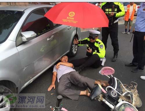 6月30日,烈日下、酷暑難耐,馬路上,車流如織。正在此時(shí),一位騎車?yán)先吮卉囎驳购篁榭s在地?zé)o法起身。緊急時(shí)刻,執(zhí)勤交警迅速趕來,一邊為老人撐傘遮擋烈日,一邊將老人的頭部枕在自己腿部,等待救護(hù)車到來。