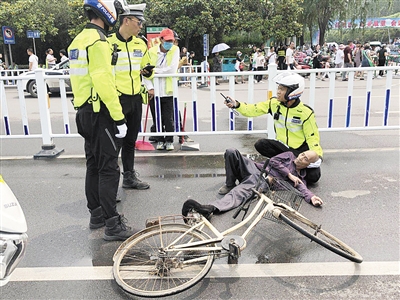 當(dāng)天上午11點(diǎn)20分,一名騎自行車(chē)的老人在淞江路與嵩山路交叉口附近突然暈倒,正在巡邏的騎警王孟召和2名同事恰巧路過(guò)。