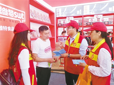 志愿者在食博會(huì)現(xiàn)場發(fā)放宣傳資料。