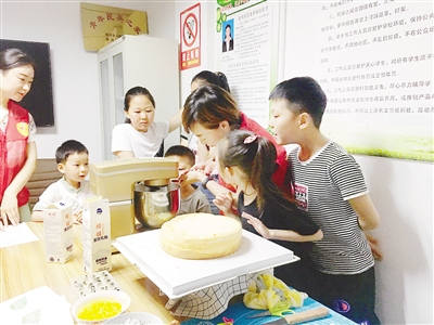 6月1日,召陵區(qū)翟莊街道燕山路社區(qū)舉辦“歡樂慶六一”活動(dòng),志愿者帶領(lǐng)孩子一起制作蛋糕。記者 于文博 攝