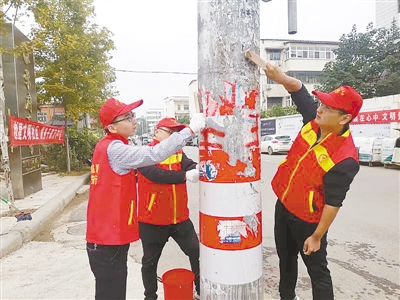 10月16日,臨潁縣人民法院組織志愿者走進轄區(qū)銀河家園小區(qū)開展志愿服務(wù)。圖為志愿者在清理電線桿上的小廣告。王 波 攝