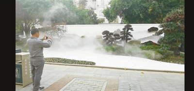 走近美景,記者看到了錯(cuò)落有致的假山、精心布局的綠植、小石子鋪成的石徑,以及不斷噴發(fā)出的水霧,真是一道美麗的風(fēng)景。