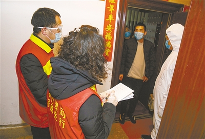 郾城區(qū)沙北街道泰山社區(qū)有物業(yè)管理健全的小區(qū),也有開放式小區(qū),還有20多個家屬院,常住人口近萬人。從大年三十開始,泰山社區(qū)18名工作人員一直堅守在防控一線,用實際行動守護社區(qū)居民安全。圖為社居委工作人員登門為居家隔離者進行身體檢測。記者 楊 光 攝