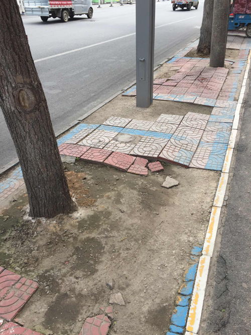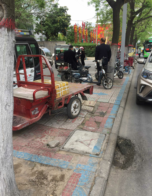 人民路涵洞以東至金山路段,行道樹(shù)間地磚破損、車(chē)輛亂停亂放。