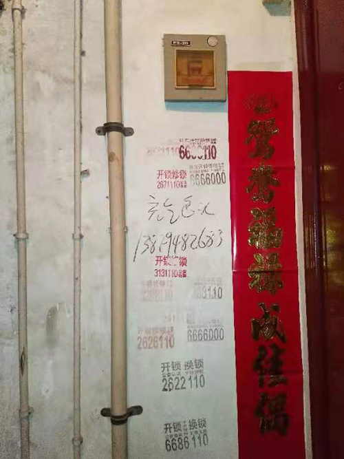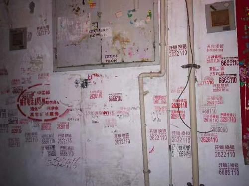 3515社區(qū)55號(hào)樓2單元樓道被寫(xiě)滿小廣告。