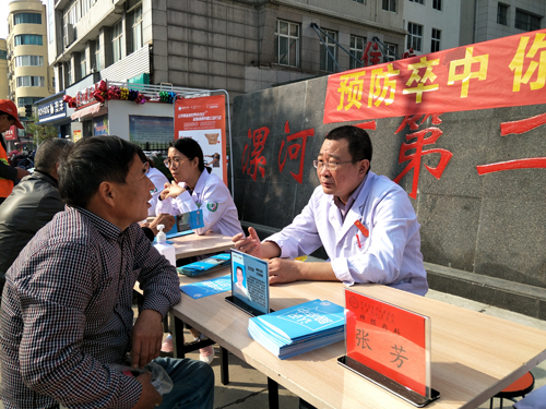 在第12個(gè)卒中日來臨之際,市二院組織神經(jīng)內(nèi)科呂杰民、張芳、張亞莉、孫艷霞等專家團(tuán)隊(duì)在醫(yī)院大門口舉辦大型義診宣傳活動(dòng)。