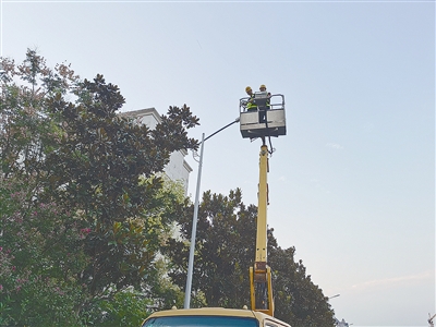 市城管局路燈維護(hù)中心工作人員在維修路燈。