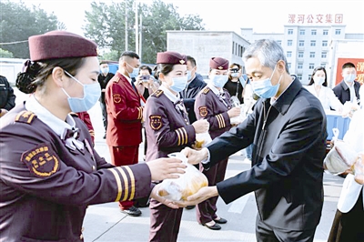 “情系公交司機(jī)”愛心早餐工程啟動(dòng)儀式上,市人大常委會(huì)副主任、市總工會(huì)主席陳平為公交司機(jī)發(fā)早餐。