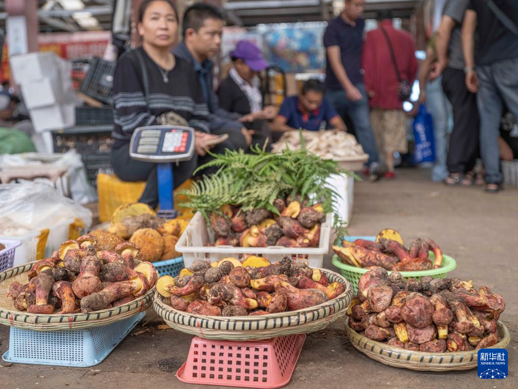 7月1日,市民在云南省文山壯族苗族自治州文山市西華菌子市場(chǎng)選購(gòu)雞樅野生菌。
