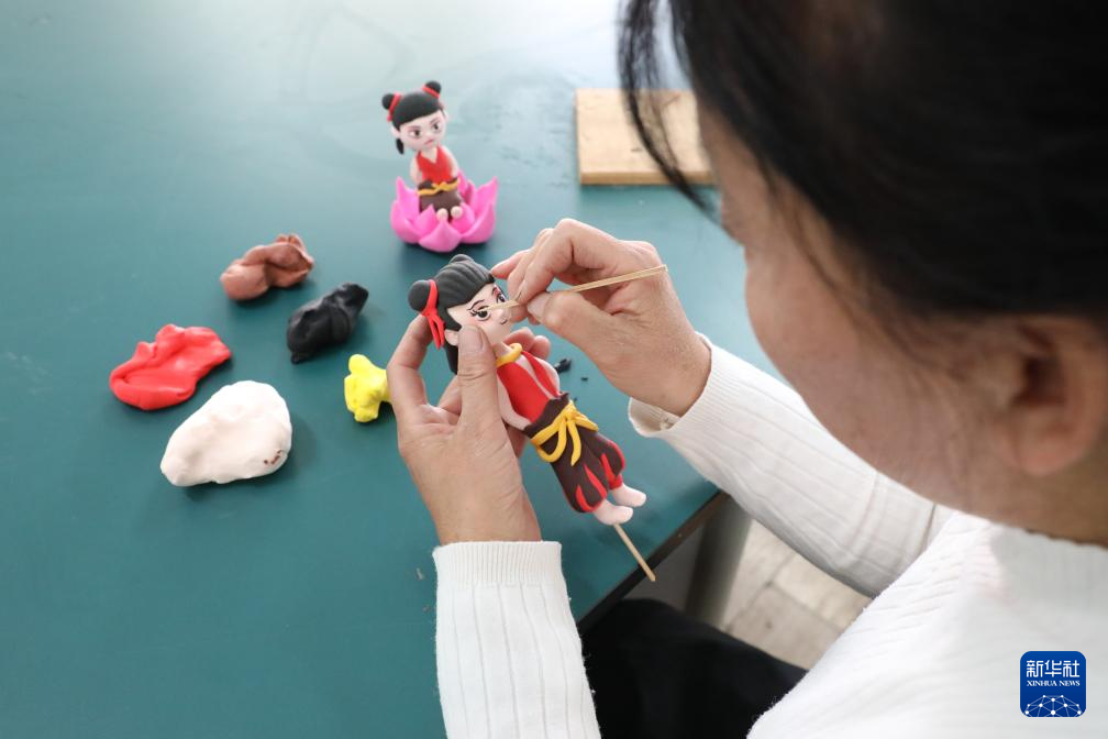 2月20日,泥塑藝人楊愛華在山東省濱州市的一所小學創(chuàng)作哪吒主題泥塑。