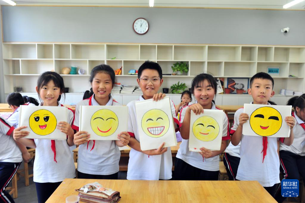 5月7日,湖北省宜昌市秭歸縣實驗小學(xué)學(xué)生在美術(shù)課堂上展示自己創(chuàng)作的笑臉卡通美術(shù)作品。