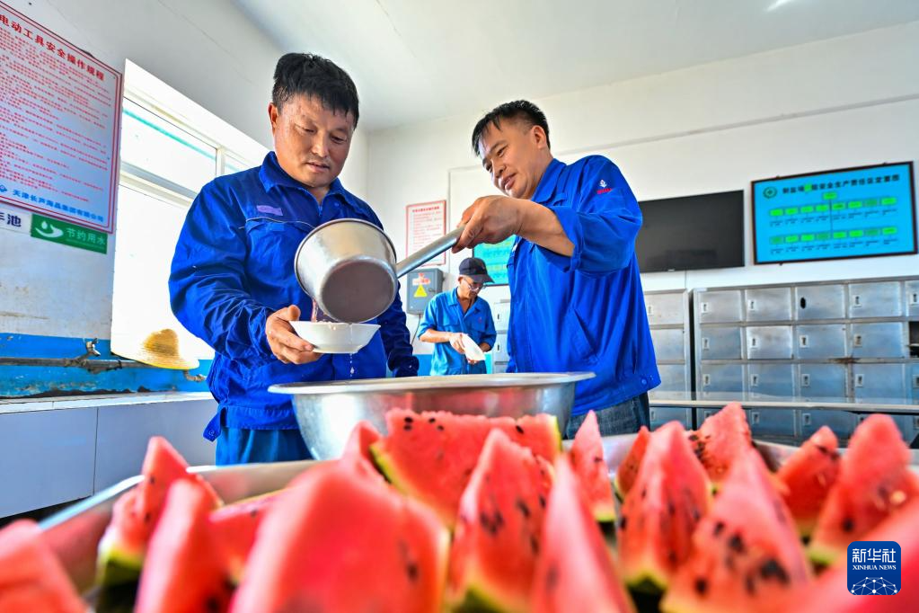 7月13日,在天津長(zhǎng)蘆海晶集團(tuán)有限公司的鹽田作業(yè)現(xiàn)場(chǎng),工人領(lǐng)取西瓜。
