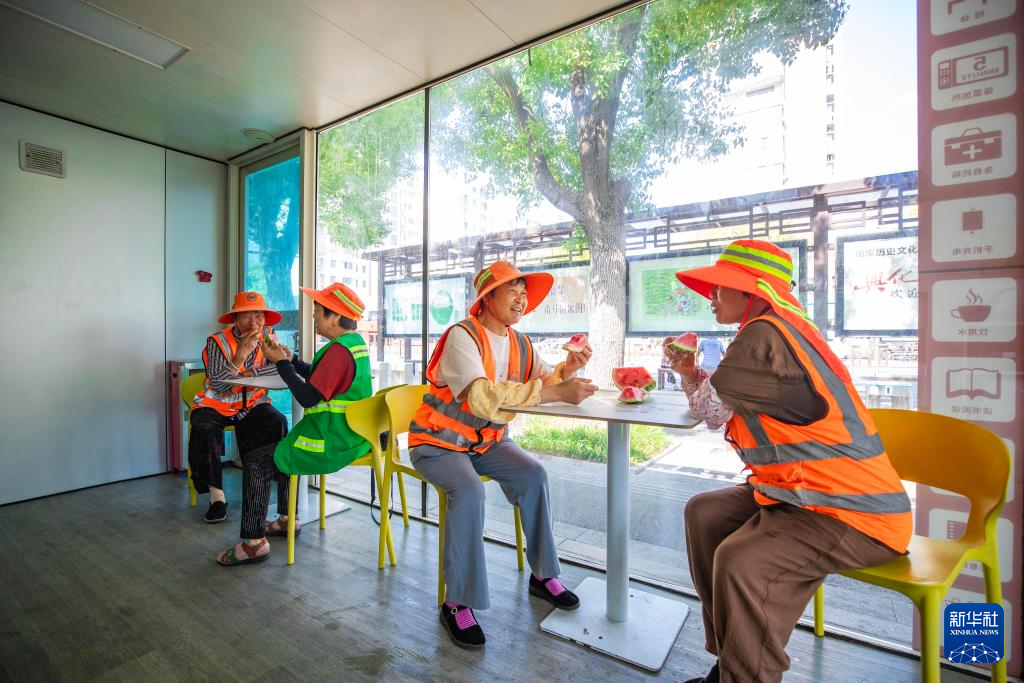 7月13日,環(huán)衛(wèi)工人在江蘇省興化市昭陽街道滄浪社區(qū)的工會(huì)驛站吃西瓜消暑。