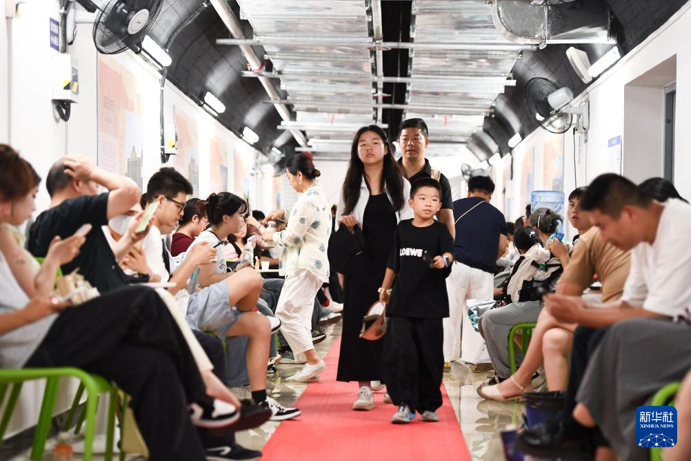 7月13日,人們?cè)谀暇┍睒O巖人防工程避暑納涼。