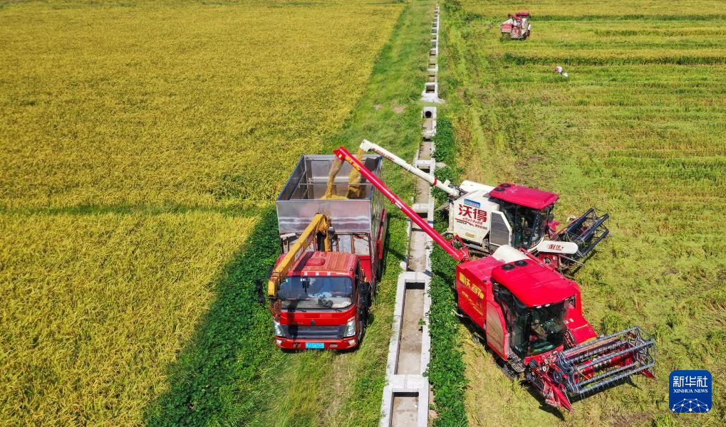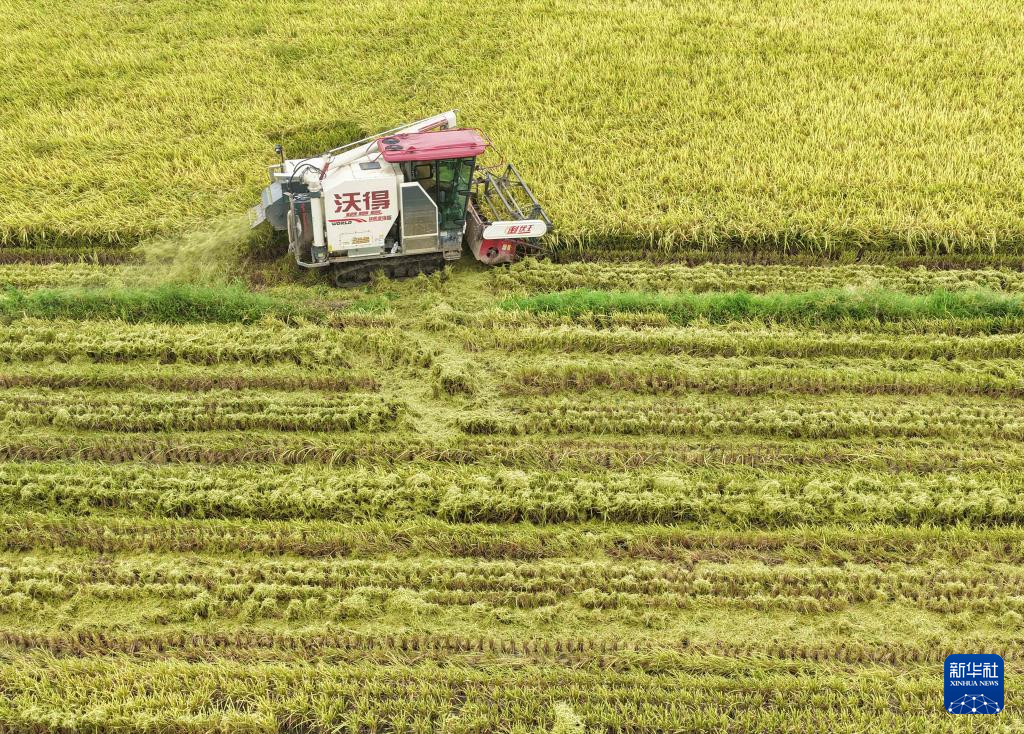 8月7日,在湖南省永州市道縣壽雁鎮(zhèn)社下村,農(nóng)民駕駛農(nóng)機(jī)收割水稻(無人機(jī)照片)。