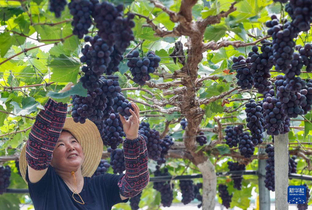 8月7日,果農(nóng)在江蘇省句容市白兔鎮(zhèn)倪塘村一家葡萄園采摘葡萄。