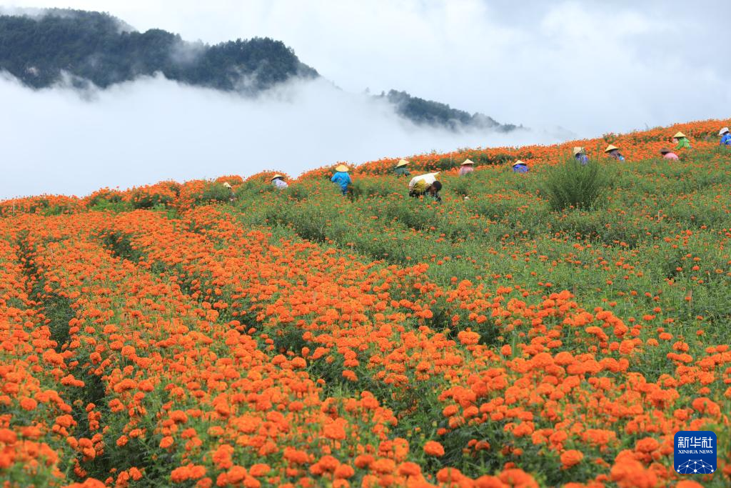 8月7日,在云南騰沖市固東鎮(zhèn),農(nóng)民采收萬壽菊。