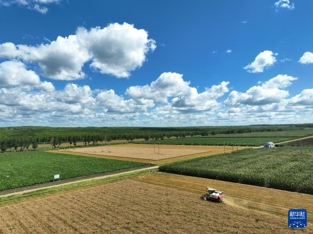 8月7日,在黑龍江省農(nóng)墾科學(xué)院九三科創(chuàng)中心,一臺收割機(jī)在小麥繁殖田進(jìn)行收獲作業(yè)(無人機(jī)照片)。
