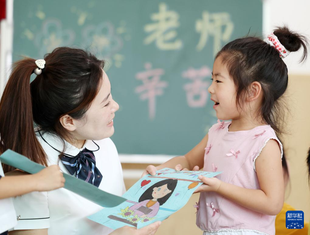 9月9日,山東省臨沂市郯城縣郯城街道官塘幼兒園的孩子將在老師的指導(dǎo)幫助下制作的繪畫(huà)送給老師。