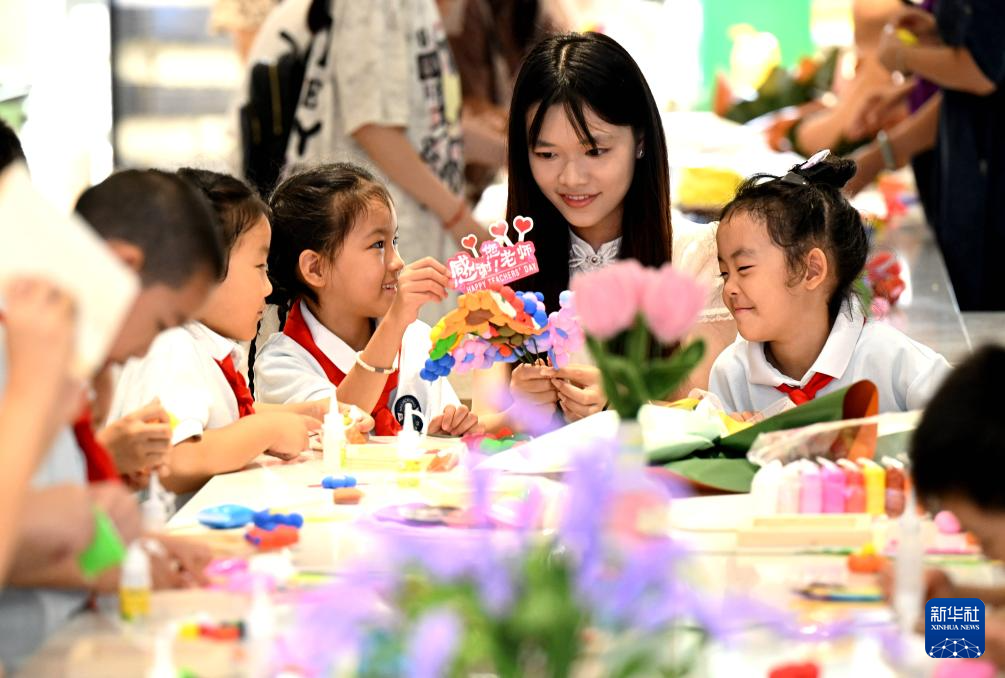9月9日,在河北省石家莊市柏林莊學(xué)校開(kāi)展的“黏土做花寄師恩”主題活動(dòng)中,孩子們用粘土制作花束,為老師送上節(jié)日的祝福。