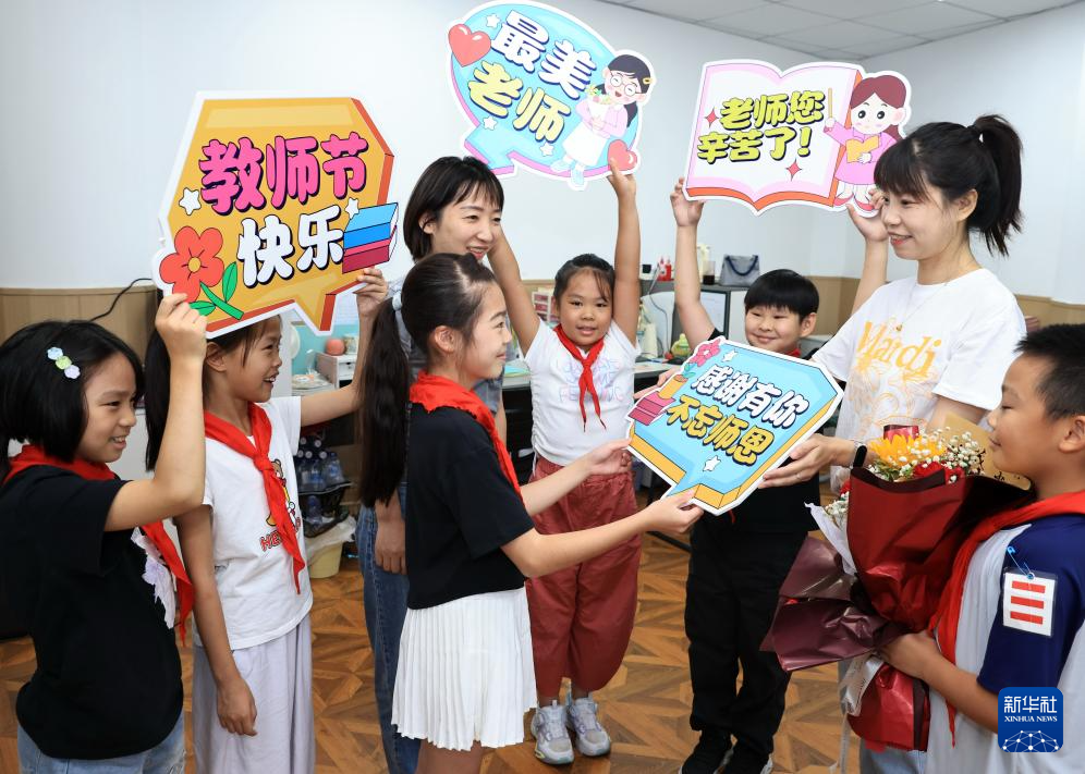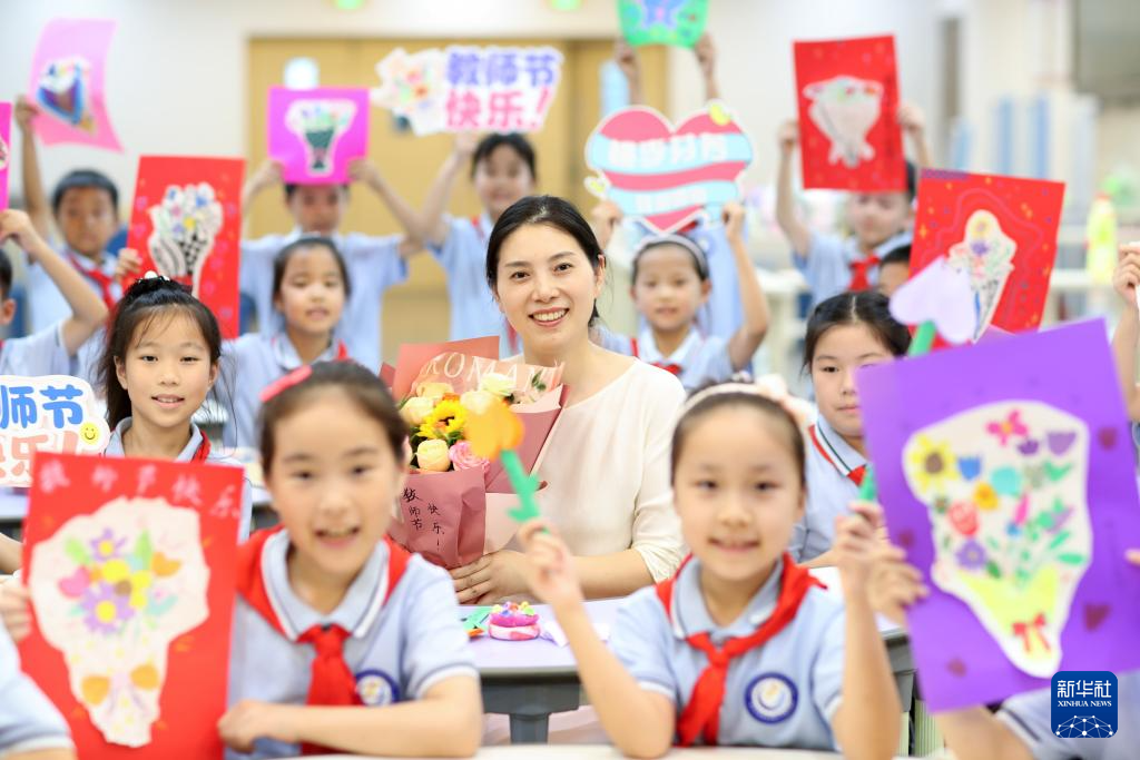 9月9日,在武漢市未來(lái)實(shí)驗(yàn)小學(xué)美林校區(qū),學(xué)生為教師送上節(jié)日祝福。