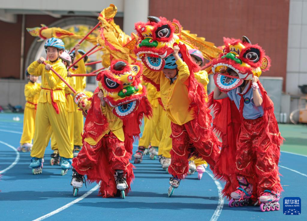 9月29日,在山東省榮成市實(shí)驗(yàn)小學(xué),孩子們表演舞龍舞獅。