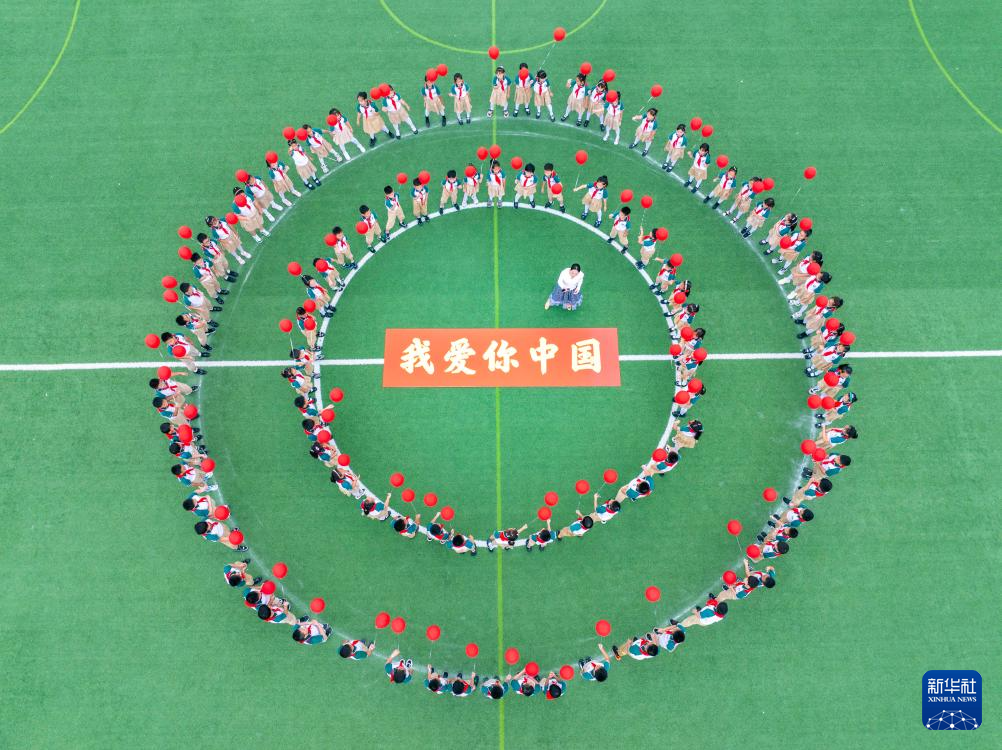 9月28日,江蘇省泰州市姜堰區(qū)東橋小學(xué)教育集團(tuán)東板橋校區(qū)學(xué)生學(xué)唱愛國(guó)歌曲,迎接國(guó)慶節(jié)(無(wú)人機(jī)照片)。