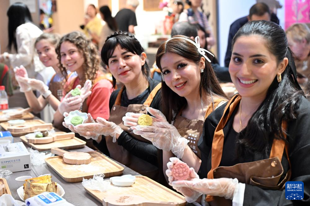 9月29日,在北京市朝陽(yáng)區(qū)于小菓點(diǎn)心模具博物館,中外青年展示自己制作的月餅。