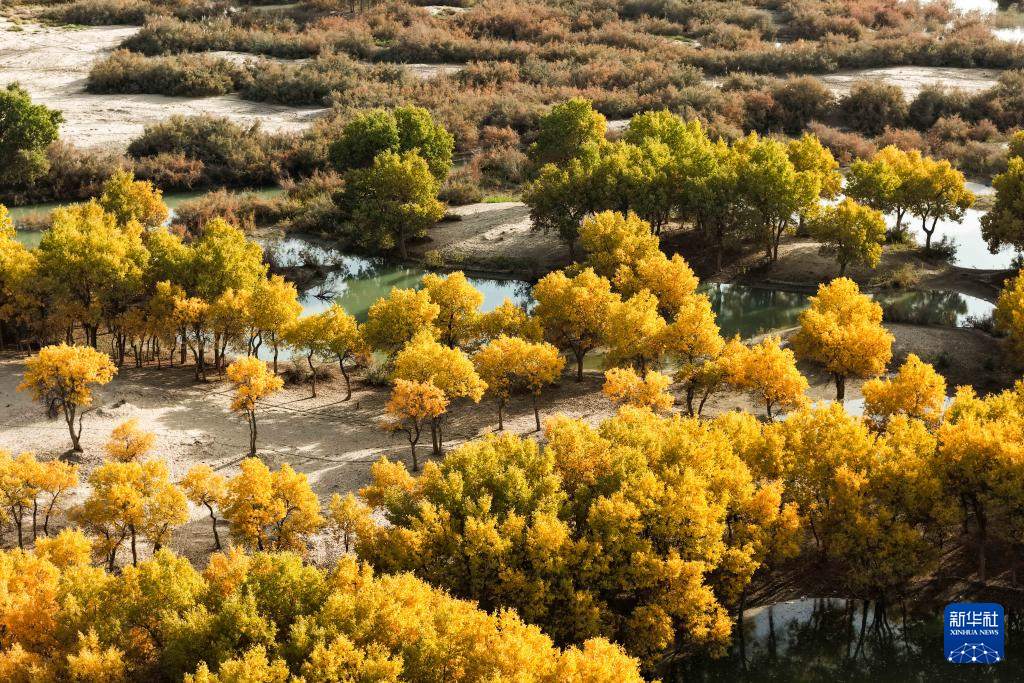 在新疆和田地區(qū)和田縣翡翠湖,成片胡楊林坐落其中(無人機(jī)照片,10月20日攝)。